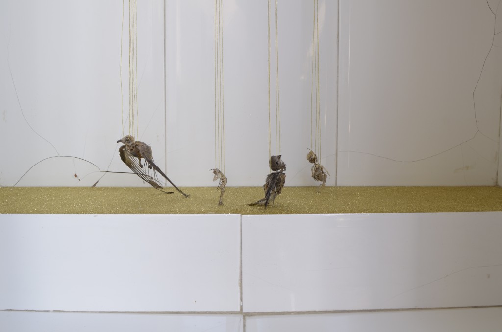 Installation in situ, oiseaux morts, fils dorés, tissus, paillettes.